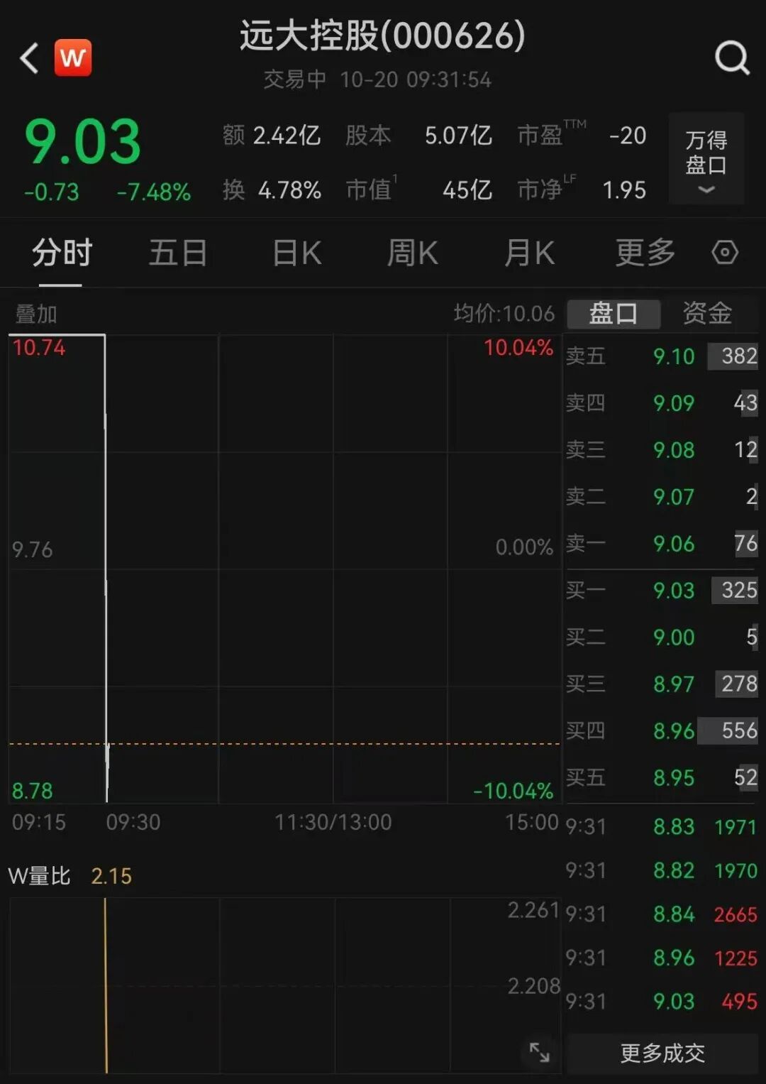 10月20日,远大控股盘初跌停,上演“天地板”。截至发稿,该股跌幅超7%,报9.03元/股,成交额2.42亿元。远大控股此前一度涨停,走出五连板。