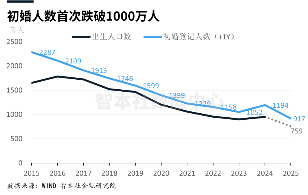 作为生育主力军,初婚人口减少直接关联新生人口 ——按 2024 年初婚数据推算,智本社数据中心预计 2025 年出生人口将降至 759 万左右。
