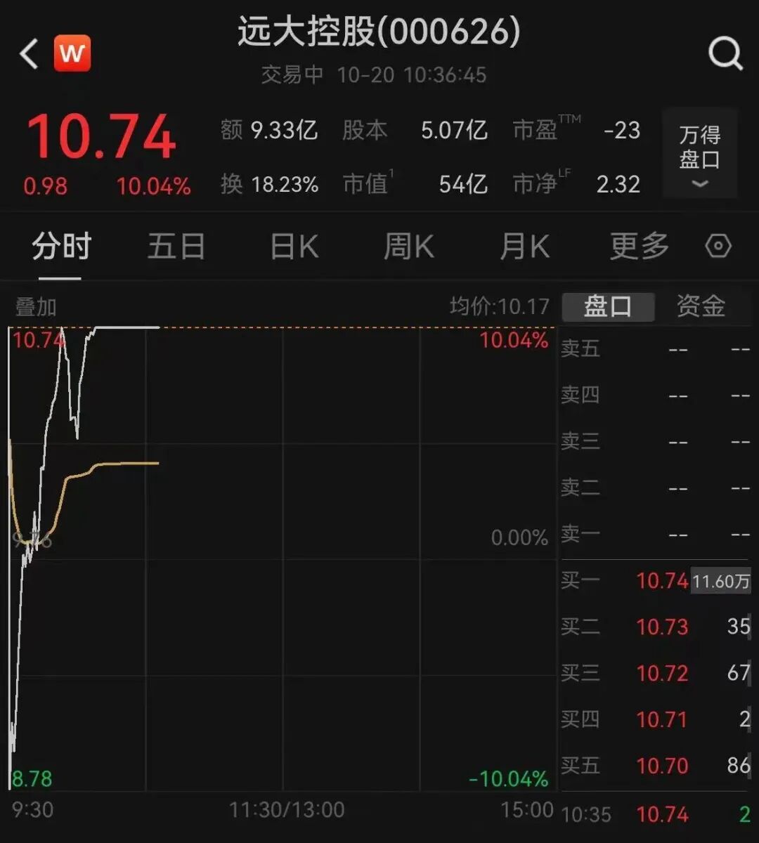 远大控股今早以涨停开盘,随后快速跳水一度触及跌停,此后再度震荡涨停。