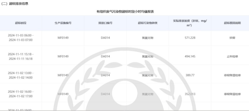 先看废气。根据双欣化学2024年排污许可执行报告,双欣化学在当年的废气排放浓度曾出现近百次的超标现象,这与双欣环保招股书和回复问询中所称的排放达标可并不一致啊。上述报告列出该公司超标污染物种类涉及氮氧化物和颗粒物等,超标原因多为停窑、设备故障、烘窑等等。