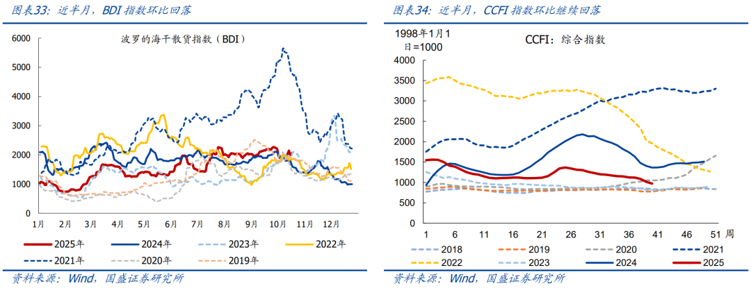 >出口运价:近半月来,BDI指数环比回落6.1%,相比2024年同期偏高13.6%;CCFI指数环比续降10.0%,相比2024年同期偏低28.3%。