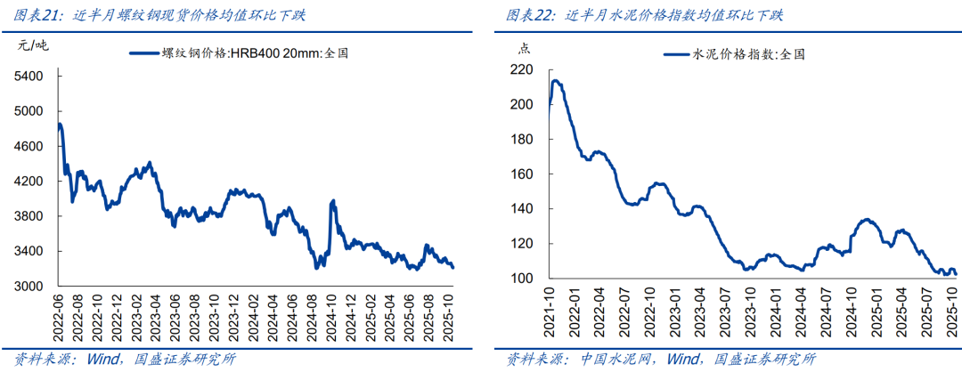 >中游工业品:近半月,钢材、水泥价格均环比下跌,其中螺纹钢现货价格均值环比下跌1.7%,水泥价格指数均值环比下跌1.6%。
