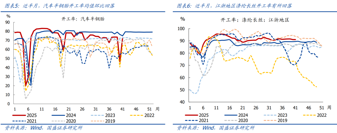 汽车、纺织开工均回落。近半月来,汽车半钢胎开工率均值环比回落14.0个百分点至59.6%,相比2024年同期偏低16.1个百分点、相比2019年同期仍然偏高4.3个百分点。江浙地区涤纶长丝开工均值环比回落0.5个百分点至91.1%,仍为近年同期次高,相比2024年同期偏高1.7个百分点,相比2019年同期偏低3.0个百分点。