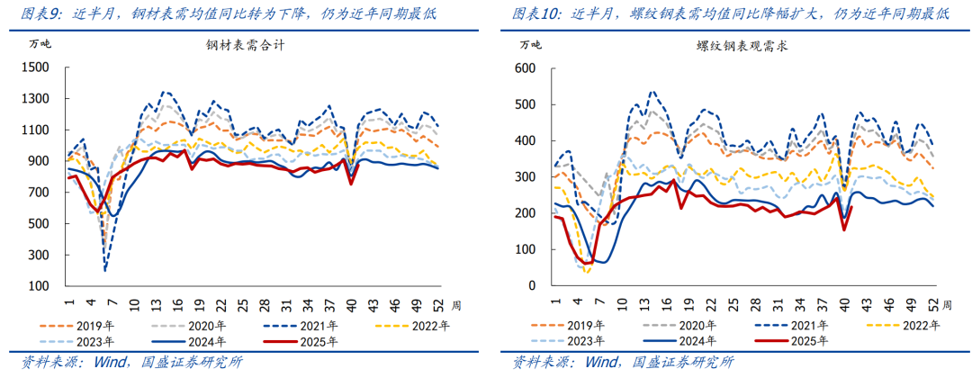 钢材表需绝对值仍为近年同期最低。近半月,钢材表观需求均值环比回落8.7%至约812.3万吨,基本持平季节规律(2019-2024年同期环比均值为-9.4%),绝对值仍为近年同期最低,同比转为下降4.4%,相比2019年同期偏低13.1%。其中:螺纹钢表需均值环比回落19.7%至约185.3万吨,弱于季节规律(2019-2024年同期环比均值为-15.1%),绝对值仍为近年同期最低,同比降幅扩大至15.0%,相比2019年同期偏低40.8%。
