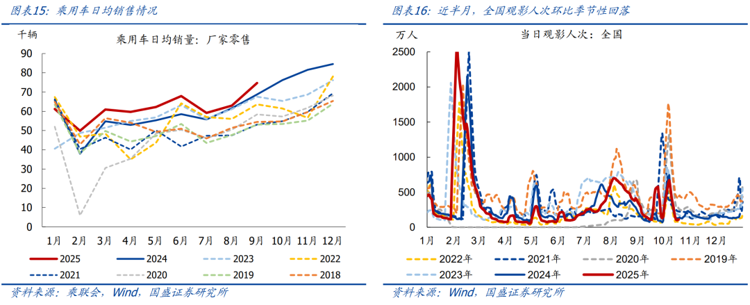 >人员流动:近半月,商业航班执飞数量均值环比小降0.3%,仍为有数据以来同期最高;相比2024年、2019年同期分别偏高3.7%、7.8%;10个重点城市地铁客运人数均值环比回落1.4%,相比2024年偏低2.3%。