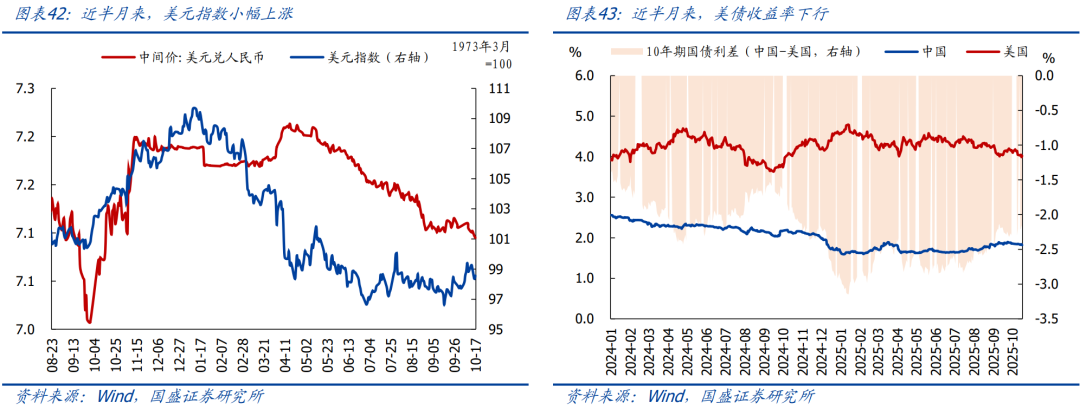 近半月来,受避险资金流动,以及日本、法国财政不稳定导致日元和欧元走弱的支撑,美元指数上涨,均值环比回升1.0%、收于98.556;人民币小幅升值,美元兑人民币(央行中间价)均值下跌0.1%。截至10月17日,10年期美债收益率较两周前下行11.0bp、收于4.02 %;中美利差(中国-美国)倒挂幅度收窄9.9bp、收于220.0bp。