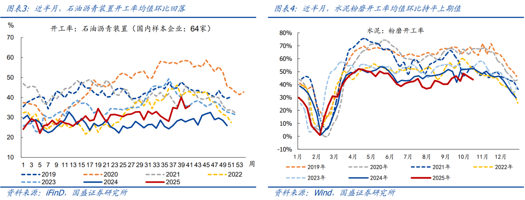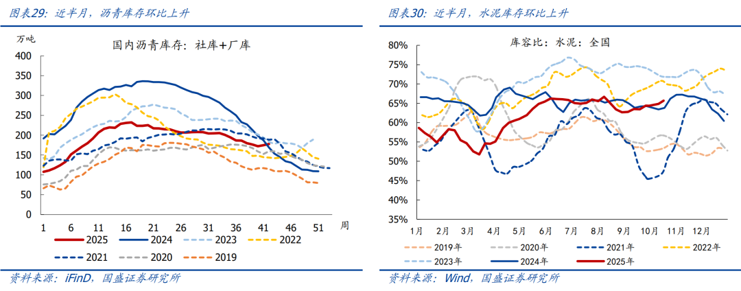 沥青库存、水泥库容比环比均上升。近半月,沥青库存(厂库+社库)环比增3.4%,同比增5.3%。水泥库容比均值环比上升0.9个百分点至65.3%,相比2024年同期偏高1.7个百分点。