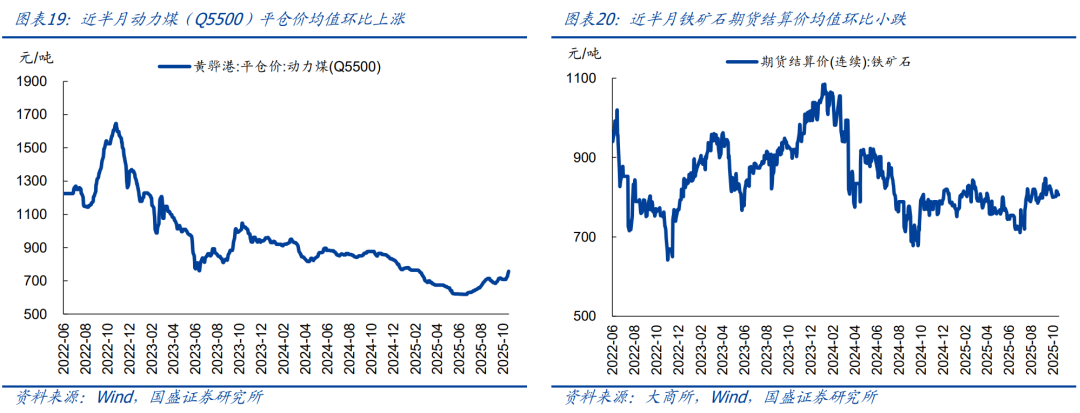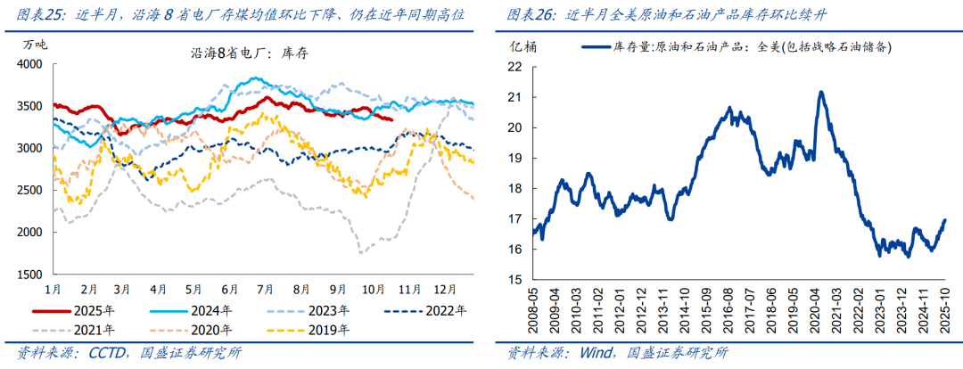 沿海8省电厂存煤环比下降,仍在近年同期高位;全美原油及石油产品库存续升。近半月来,沿海8省电厂存煤均值环比下降2.6%,弱于季节规律(2017-2024年同期环比均值为升2.4%),绝对值仍在近年同期高位,同比转为-3.8%、相比2019年同期偏高27.1%。截至2025年10月10日,全美原油及石油产品库存环比续升147.8万桶,绝对值回升至16.97亿桶。