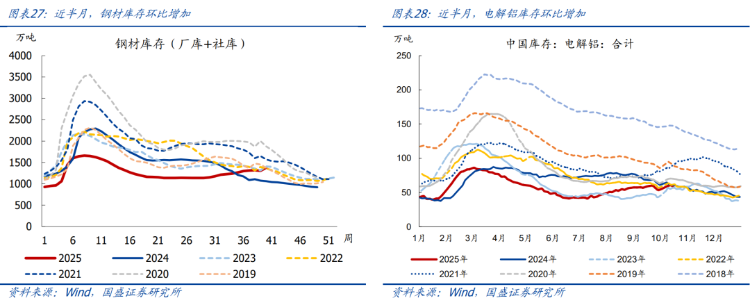 钢材、电解铝库存均环比增加,但绝对值仍在近年同期低位。近半月来,钢材库存环比增加4.7%,同比增幅扩大至29.7%。电解铝库存环比增加4.0%、绝对值仍为近年同期次低(仅高于2023年同期),同比降幅收窄至5.0%。