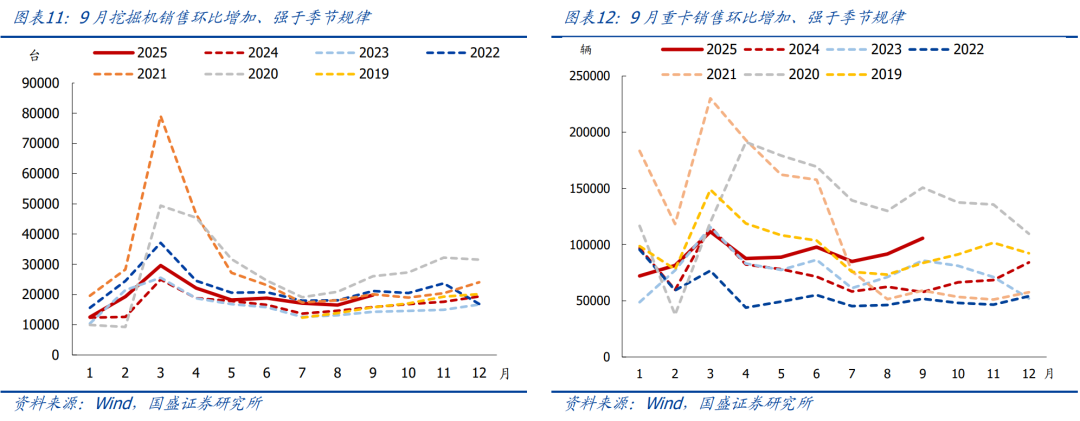 挖掘机、重卡销售环比增加,同比增幅扩大。9月挖掘机销量1.99万台,环比8月上升20.2%,强于近年同期均值(2019-2024年同期均值为回升14.0%),同比增幅扩大至25.4%。其中:国内销售0.92万台,环比8月上升20.4%,同比增21.5%。9月重卡销量10.56万辆,环比8月上升15.2%,强于近年同期均值(2019-2024年同期均值为回升11.7%),同比增幅扩大至82.9%。