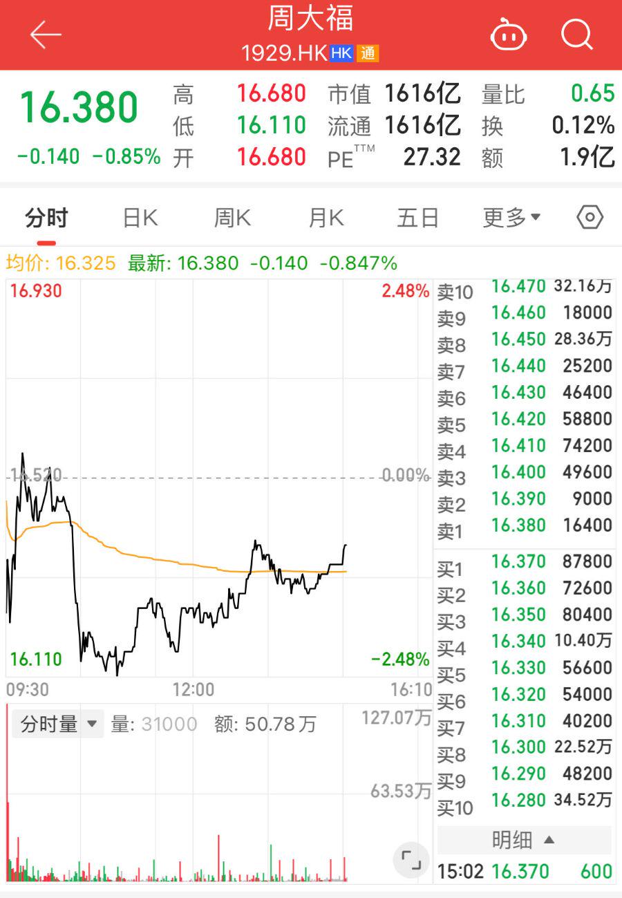 二级市场方面,截至15时02分,周大福报16.38股/港元,下跌0.85%。