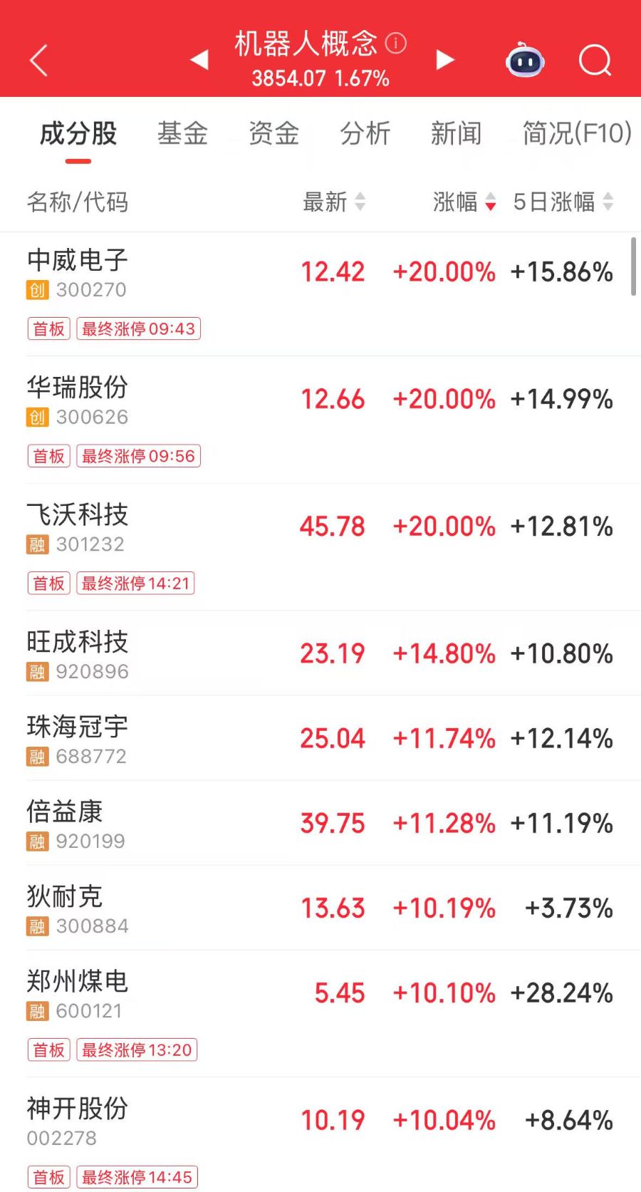 10月20日,机器人概念指数(885517.TI)涨1.67%,16只成分股涨停,其中中威电子(300270.SZ)、华瑞股份(300626.SZ)、飞沃科技(301232.SZ)20cm涨停,旺成科技(920896.BJ)、珠海冠宇(688772.SH)、倍益康(920199.BJ )等多只股票跟涨。