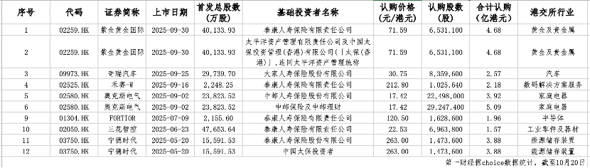 中国太保及旗下子公司也频繁亮相基石投资者名单,分别出现在紫金黄金国际与宁德时代的IPO中,认购金额分别约为4.68亿港元与3.88亿港元。