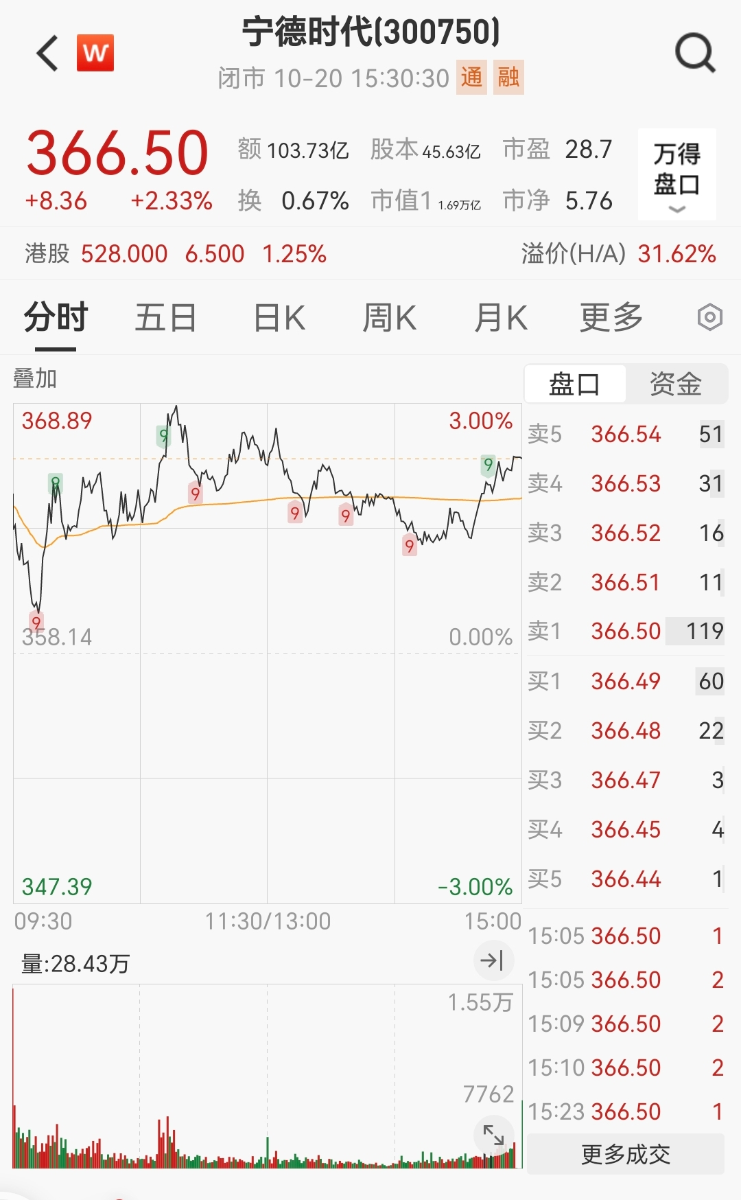 二级市场变现上,截至10月20日收盘,宁德时代A股收涨2.33%,港股收涨1.25%。市值报1.69万亿元。