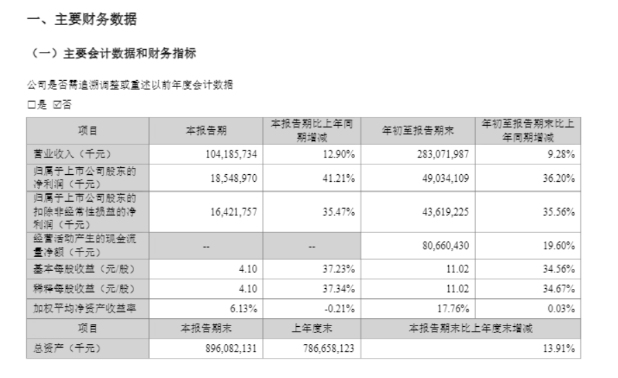 10月20日晚间,宁德时代发布三季报,季报显示,第三季度净利润185亿元,同比增长41%;第三季度营收1041.9亿元,同比增长12.9%;第三季度扣除非经常性损益的净利润164亿元,同比增长35%。