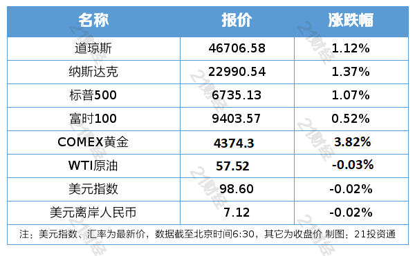 1、美股高开高走,三大指数均涨超1%。大型科技股普涨,苹果涨约4%,创历史新高,总市值升至3.89万亿美元,成为美国第二大市值公司,超越微软,仅次于英伟达。纳斯达克中国金龙指数收涨2.39%,热门中概股多数上涨。爱奇艺涨超8%,蔚来涨近5%,金山云涨超4%,阿里巴巴涨近4%。COMEX黄金期货涨3.82%。