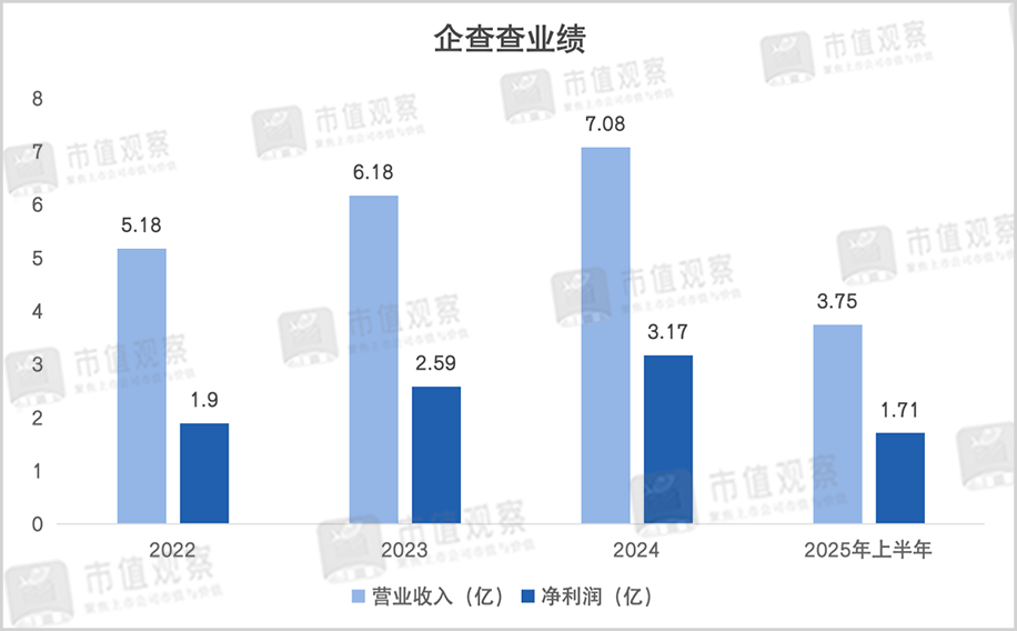 从业绩上来看,近年来企查查维持着较快的增长步调。招股书显示,2022年至2024年间实现营业收入分别为5.18亿、6.18亿、7.08亿,期间复合增长率为16.89%,归母净利润为1.9亿、2.59亿和3.17亿,复合增速达29.17%。