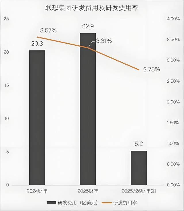 2022/23-2024/25的最近三个连续完整财年,联想集团的研发投入分别仅为,156.38亿元 、144.48亿元 、163亿元,其研发费用率分别为3.54%、3.57%、3.31%,在联想2025/26财年第一季业绩报告中,研发费用为37.32亿元,对应研发费率仅2.78%;