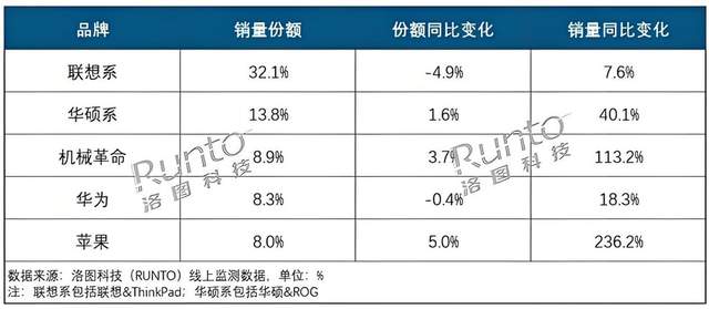 来自洛图科技的统计数据还显示,2025年上半年,除抖快等内容电商外的中国笔记本电脑线上公开零售市场,销量为560万台,同比大涨24.0%,销额达377亿元,同比大涨42.4%,联想系凭借高达32.1%的线上份额排名第一,销量相当于华硕系+机械革命+华为之和。