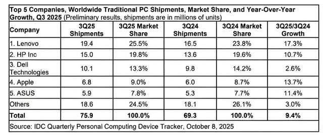 单纯看联想集团的销量和财报,不可谓不漂亮,来自IDC统计的25Q3最新全球PC市场的份额数据显示,联想以1940万台出货量和25.5%的份额继续蝉联世界冠军,其高达17.3%的增速亦超过行业平均水平;