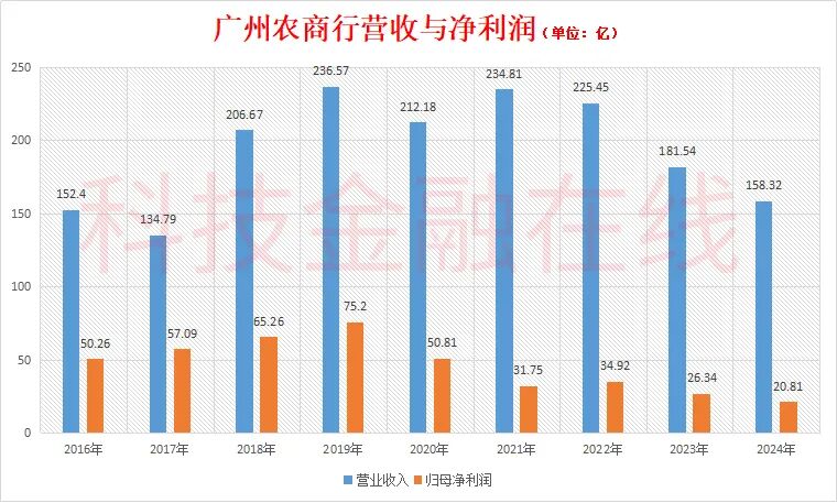 2024年,广州农商行实现营业收入158.32亿,同比下降12.79%;实现净利润24.16亿,同比下降25.89%;实现归母净利润20.8亿,同比下降21.02%。