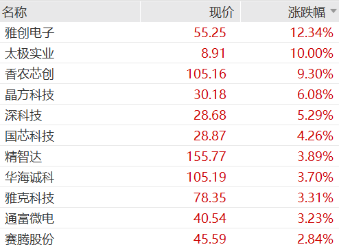 10月21日早盘,A股存储芯片概念集体走强,截至11:12,雅创电子涨超12%,香农芯创涨9.3%,太极实业涨10%,云汉芯城、普冉股份、江波龙等涨幅明显。