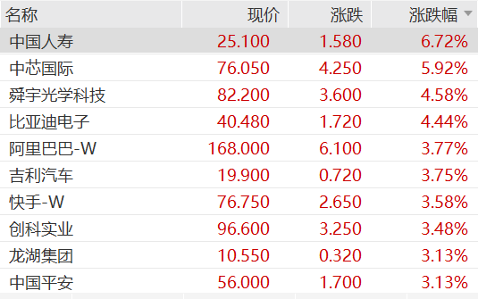 香港恒指涨近2%,恒生科技指数持续走强涨超3%。科网股表现强势,汽车股盘中冲高,哔哩哔哩涨超10%,中芯国际涨超6%,比亚迪电子涨约5%,小鹏汽车、快手涨超4%,阿里巴巴涨超3.7%。