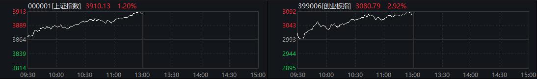 中新经纬10月21日电 21日,A股三大股指高开高走。截至午盘,上证指数涨1.20%报3910.13点,深证成指涨1.97%报13065.58点,创业板指涨2.92%报3080.79点。