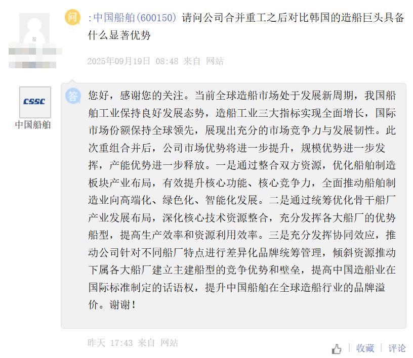10月20日,中国船舶在互动平台上表示,当前全球造船市场处于发展新周期,我国船舶工业保持良好发展态势,造船工业三大指标实现全面增长,国际市场份额保持全球领先,展现出充分的市场竞争力与发展韧性。此次重组合并后,公司市场优势将进一步提升,规模优势进一步发挥,产能优势进一步释放。