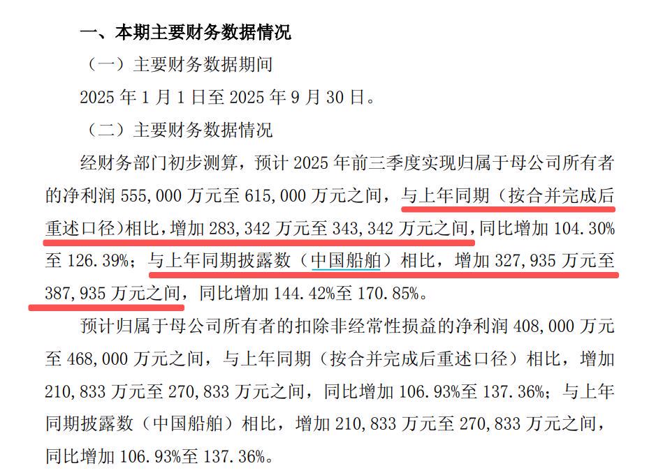 公告披露,经财务部门初步测算,中国船舶预计2025年前三季度实现归母净利润55.5亿元至61.5亿元之间,与上年同期(按合并完成后重述口径)相比,同比增加104.30%至126.39%;与上年同期披露数(中国船舶)相比,同比增加144.42%至170.85%。