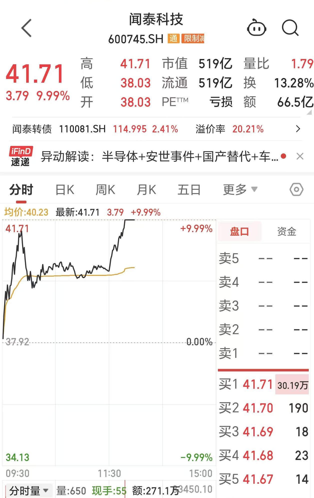 闻泰科技午后涨停,报41.71元/股,成交额约66.5亿元。(中新经纬APP)