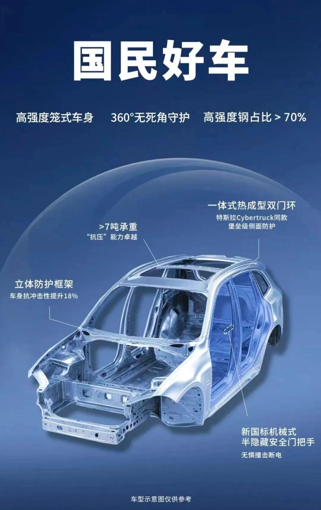 据悉,车身结构方面,其采用高强度笼式设计,高强度钢占比超70%,正面立体防护框架使车身抗冲击性提升18%;侧面配备一体式热成型双门环,采用与特斯拉Cybertruck同源技术,并搭配新国标机械式半隐藏安全门把手。