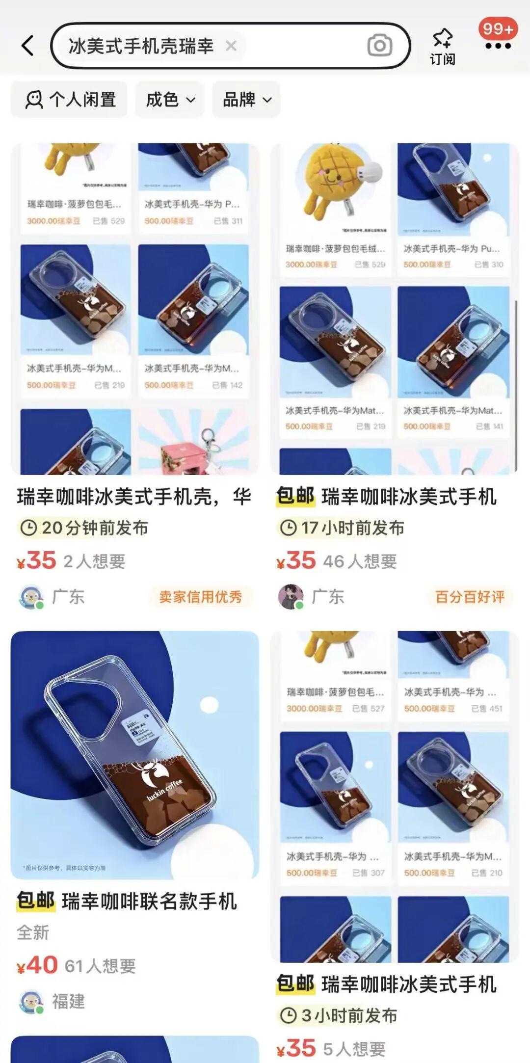 据了解,该手机壳目前仅瑞幸内部员工通过“小燃卡”兑换。查询二手交易平台发现,该手机壳目前售卖价格在35元左右,包含苹果、华为等多种型号的手机。