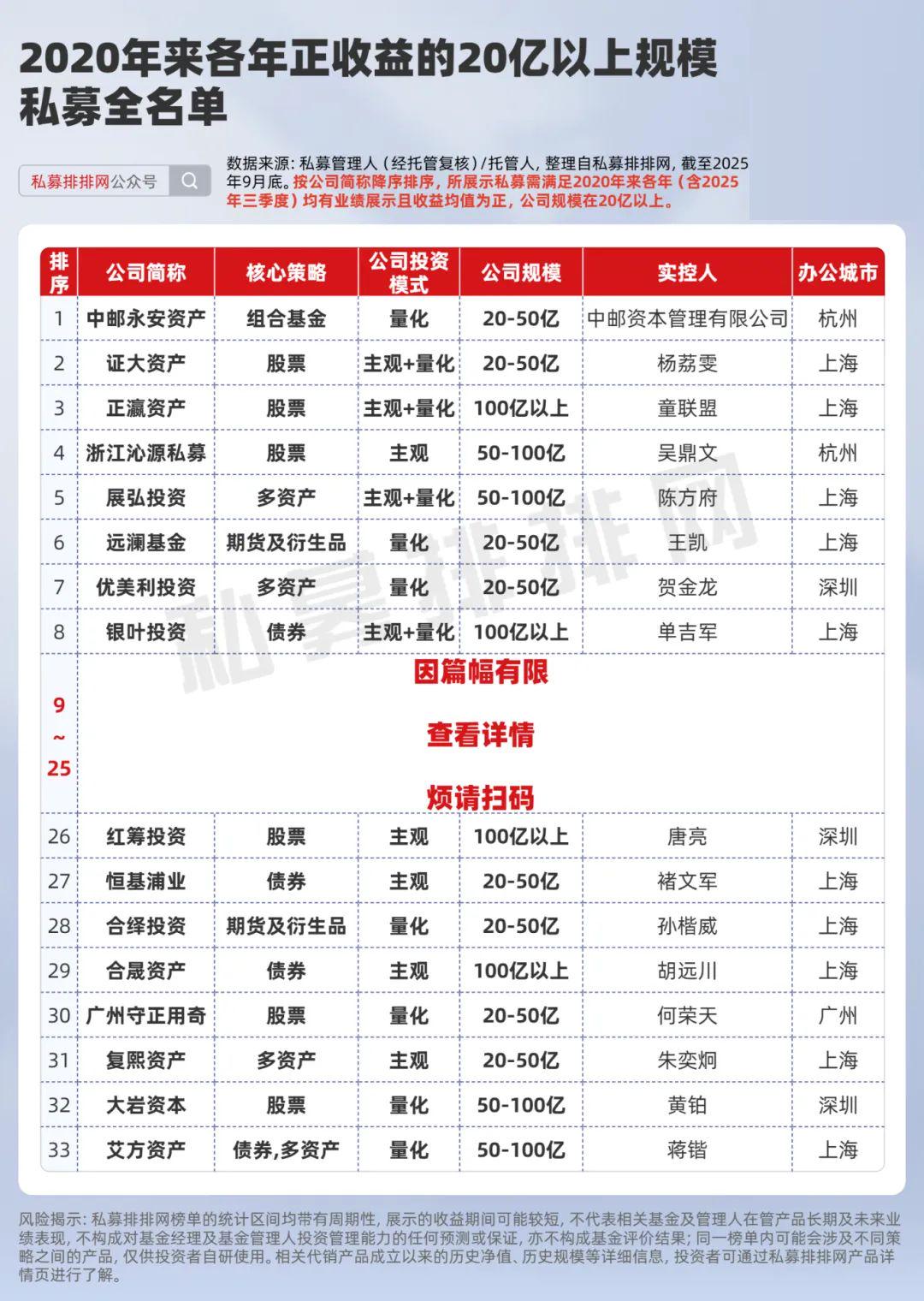 私募排排网数据显示,上述117家2020年以来连年正收益的私募中,规模在20亿以上且旗下每年符合排名规则的产品均在3只及以上的有9家,其中,百亿私募、准百亿私募、20-50亿私募均3家。