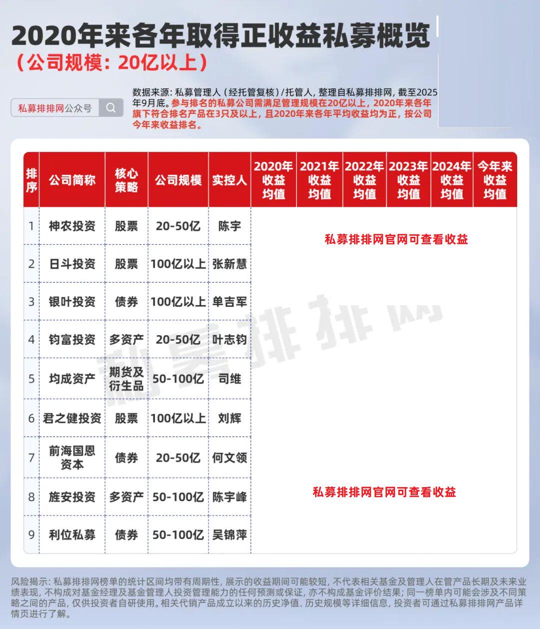 另外,2020年来连年实现正收益的百亿私募还有银叶投资、君之健投资。君之健投资成立于2015年11月,坚守价值投资理念,顺势而为,波段操作,善于挖掘低估且有安全边际的投资品种,力争在控制好回撤的同时致力于长期可持续的增长。公司2020-2024年及2025年前三季度收益均值分别为***%。