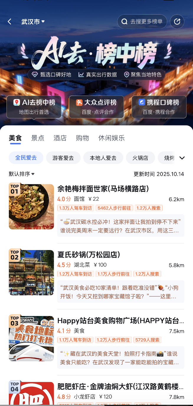 与高德扫街榜一样,百度地图“AI去·榜中榜”也是基于真实出行数据产生。不同的是,百度在几年前与大众点评进行了合作,再加上百度与携程口碑榜达成合作, “爱去榜”页面就整合了三大榜单:百度自主生成的“AI去榜中榜”、大众点评榜、携程口碑榜。用户点击即可分别跳转至美团和携程,串联了地图、本地生活、酒旅等服务。