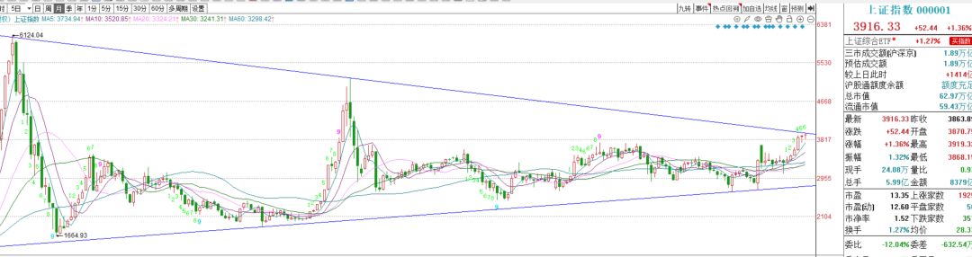 10月21日,今天A股大涨,创业板大涨3%,沪指收盘站上了3900点,从技术指标来看,沪指的20年压力线(月线)大致在3920一线,理论上,既然大盘选择反弹,那么上证指数这一次应该能够突破前高3936,之后应该有一轮上冲过程,我们精确操盘体系(周预测)测算出来的的短期目标4153点。