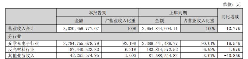 目前,水晶光电营收主要来源于消费电子的光学元器件、薄膜光学面板,二者营收占比超90%,是绝对的业绩支柱。