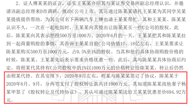 饭局之后,王巧全迅速采取了行动,他毫不避讳地向傅某某提出,希望“价格能便宜就便宜点”,并安排其代理人陈某某出面操作。经过商议,双方敲定了一笔看似平常却暗藏玄机的股权转让协议。2020年8月至9月期间,由陈某某的妻子出面,与傅某某指定的股权代持人程某签订协议,以1000万元人民币的价格,购入了C公司1%的股权。