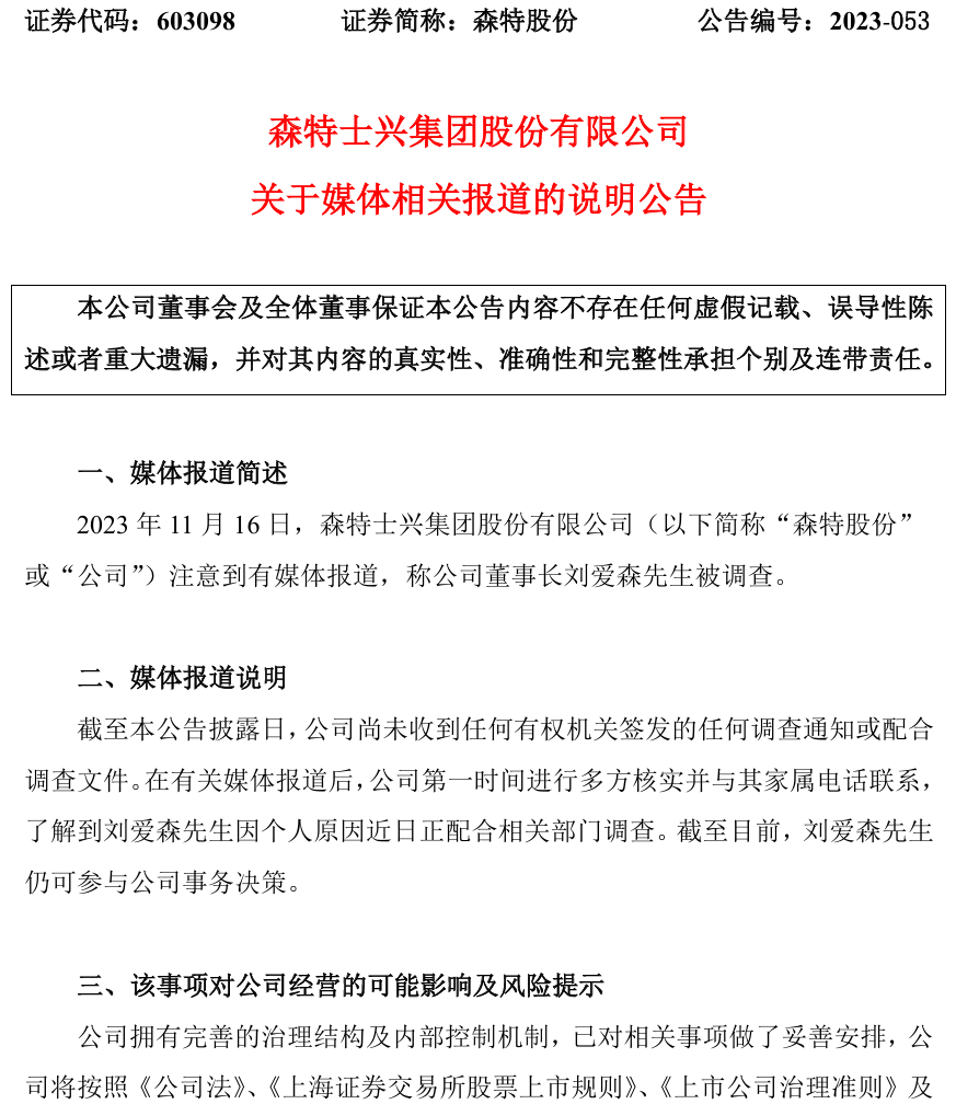2023年11月17日盘后,森特股份公告称,了解到刘爱森因个人原因近日正配合相关部门调查,目前仍可参与公司事务决策。