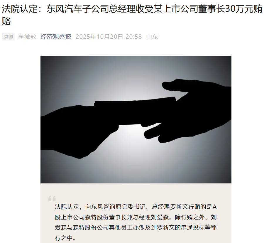 报道特别指出,在罗新文受贿环节中,法院认定行贿方为A股上市公司森特股份(603098.SH)董事长兼总经理刘爱森。