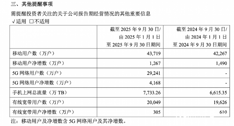 而无独有偶,就在一日前根据中国移动的三季报,其传统移动业务同样面临压力——第三季度移动ARPU降至48.0元/户·月,较第二季度的49.5元下降1.5元,降幅达3%。虽然手机上网DOU提升至17.0GB,同比增长8.1%,但流量价值的持续稀释显然拖累了收入表现。移动客户总数达10.09亿户,5G用户6.22亿户,用户规模的微增无法抵消ARPU下行的冲击。