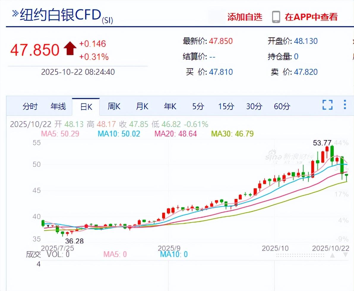 银的跌幅更猛一些,从前几天的高点53.77美元跌到了47.85美元,跌幅达到了11%。