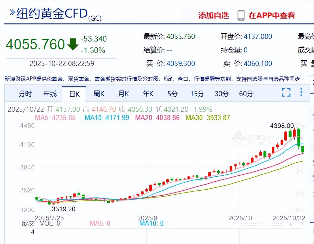 纽约金价已经跌到了4055.76美元/盎司,相比前几天的高点跌了7.8%。