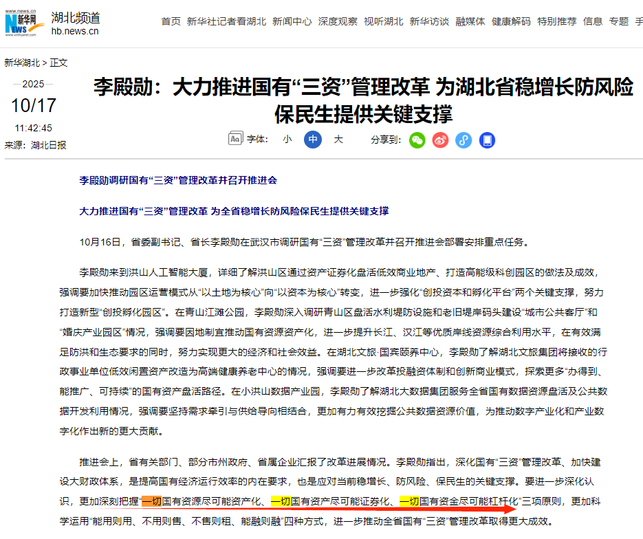 湖北的思路就是,把这些资源、权利都变现,用来化债、稳增长。这就是一切国有资源尽可能资产化的意思。