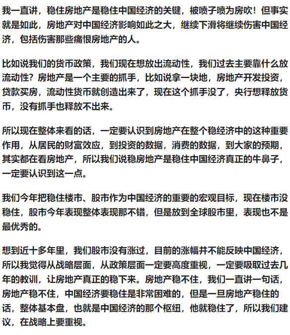 我仍然呼吁,鉴于房地产的预期恶化,在政策层面必须有强有力的措施稳定房地产的预期。