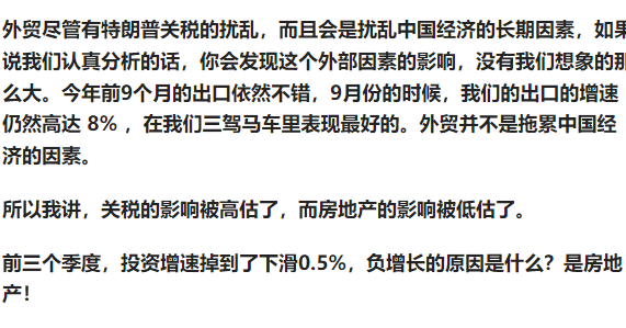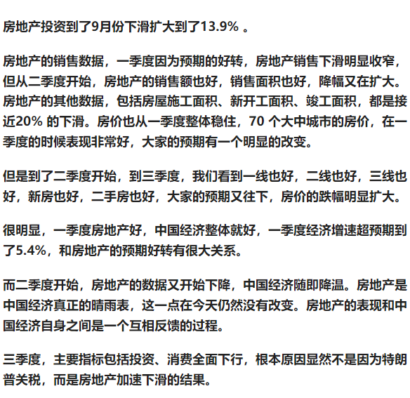 正如我之前文章所言,三季度经济增长掉到4.8% ,关键在内因而不是外因。特朗普的单边主义和关税固然对中国经济有很大影响,但真正的影响是房地产加速下滑导致。