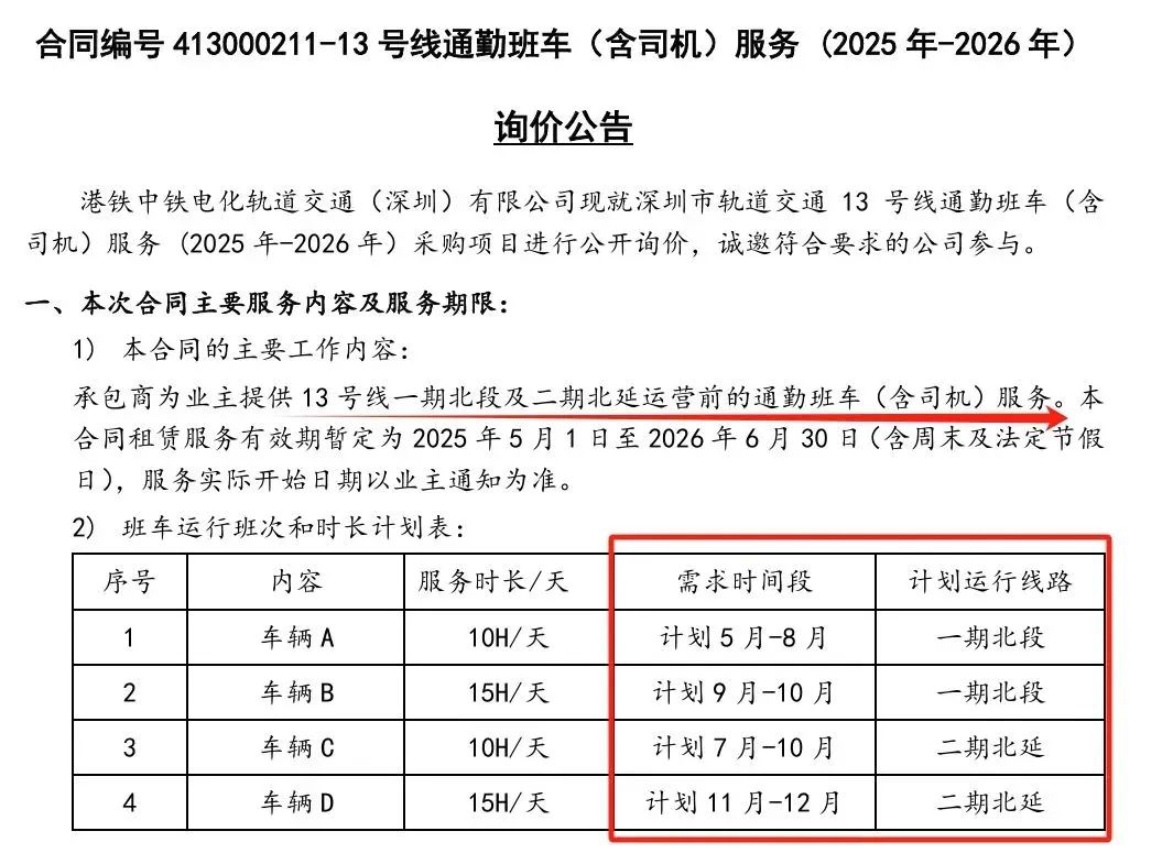 港铁深圳官网公布《13号线通勤班车(含司机)服务 (2025年-2026年)询价公告》