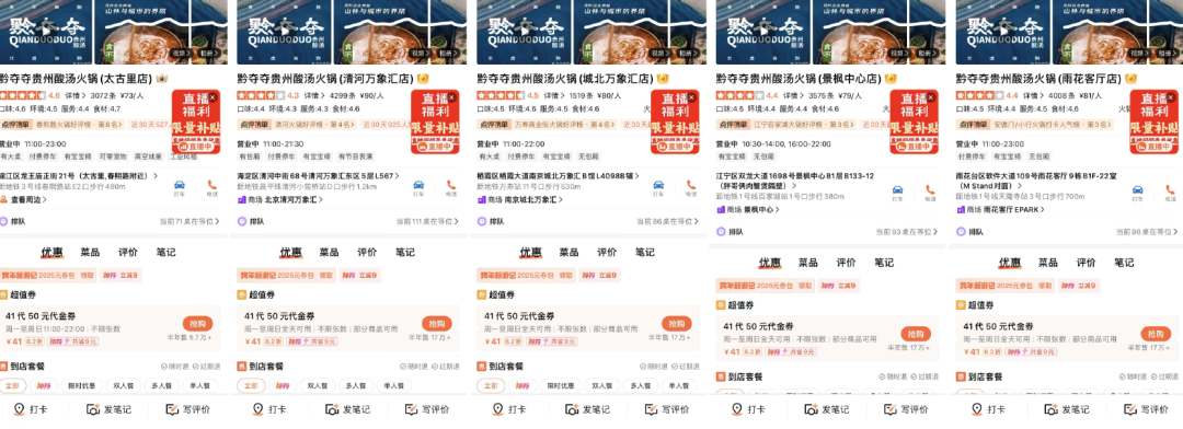 在抖音平台上,有关黔夺夺贵州酸汤火锅的话题超过1600万次,小红书平台上,网友们前往黔夺夺门店打卡和分享的笔记内容非常有吸引力。门店拿下大众点评多榜第一,市场人气颇高。
