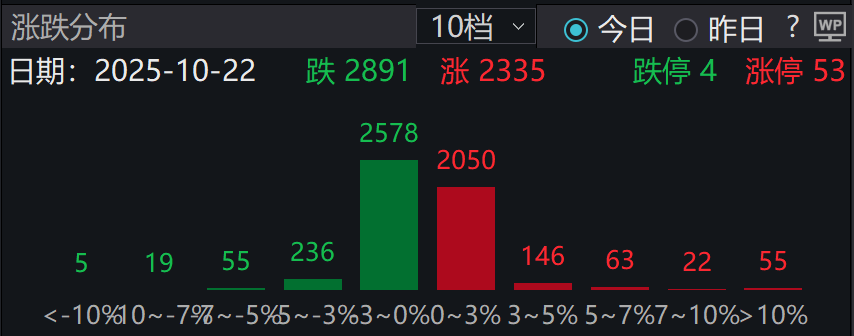 10月22日午盘,沪指跌0.44%,深成指跌0.81%,创业板指跌0.89%。黄金等有色行业集体下挫,锂电池、存储芯片、稀土板块普跌;地产、银行涨幅居前,核聚变、风电、深地科技概念表现活跃。全市场近3000只个股下跌。